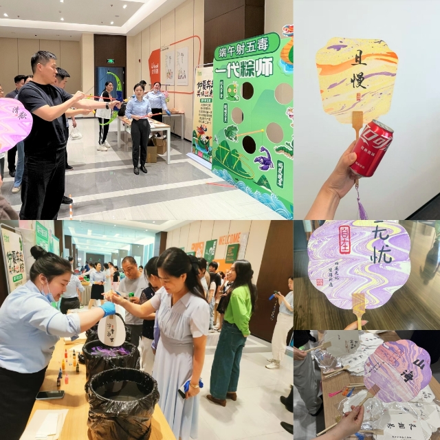 5月29日,在公司餐厅开展的“仲夏奔赴・美味出粽”端午趣味活动,吸引了众多员工热情参与。活动现场最具人气的“端午射五毒”游戏,参与者手持弓箭瞄准背景板上的蛇、蝎等“五毒”图案,在体验传统民俗竞技乐趣的同时,寄托驱邪避毒、祈福安康的心愿。同步开展的非遗漆扇制作活动让员工通过亲手创作进一步深化对非遗文化的认知。成品扇子上,“山海”“无忧”“且慢”等字样与端午元素、传统书法相映成趣。