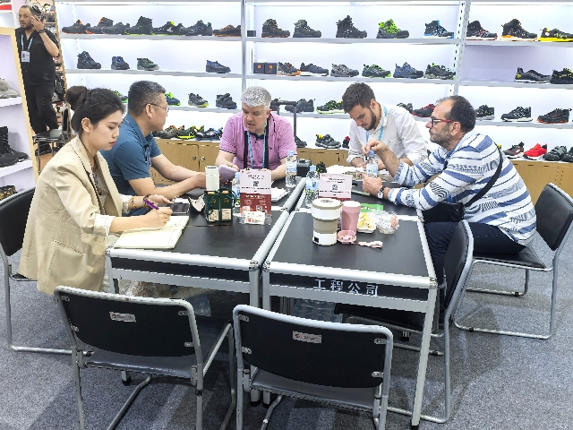 鞋类展区以“创新科技,时尚出行”为主题,集中呈现了运动休闲、户外功能等多类产品。主打的轻便安全鞋采用先进的减震与防护技术,兼具轻量化与高强度特性,获得欧美客户的高度认可,开展首日就迎来大量客户询价洽谈;使用环保耐磨材料制成的雪地靴,凭借出色的保暖与防滑优势,成为北欧市场的潜力爆品。