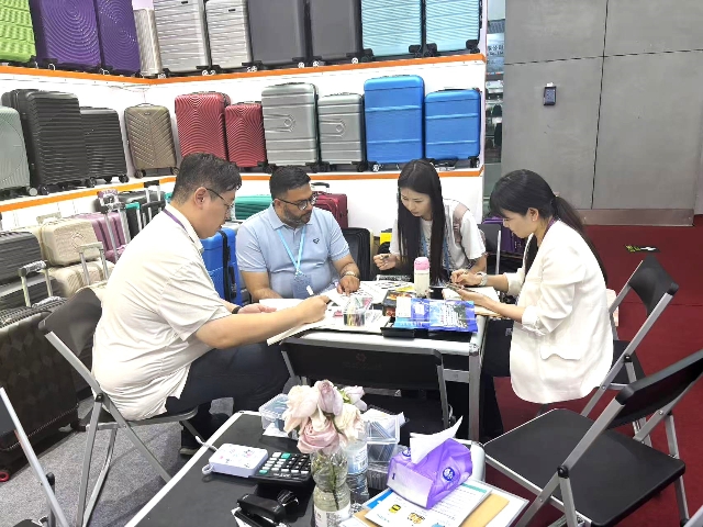 箱包展区推出70余款不同材质和设计的产品,如超轻材质PP拉杆箱、ABS拉杆箱、旅行布箱等。其中PP拉杆箱因其高性价比,受到欧洲、中东、南美客商青睐。参展期间,业务团队根据客商反馈,及时调整展品布置,确保每日展出的箱包品类与陈列形式持续更新,大大提升了客户体验。