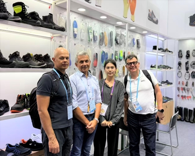 在工具类展区,欧冠平台官网_欧冠online(中国),在常规安全鞋产品基础上,新增劳保手套、多功能剪刀、冰爪、反光材料等多款新产品,全面覆盖户外安全防护场景,凸显“专业性”与“全面性”双重优势。为让客户直观感受产品品质,展区采用原木色层板与洞洞板灵活组合的装修设计,方便客户触摸、体验产品的材质、工艺与功能,如拉扯劳保手套的耐磨度、体验多功能剪刀的剪切效果、查看反光材料在模拟黑暗环境下的警示亮度。目前已有来自法国的户外用品品牌商提出样品寄送需求,另有来自智利的的安全防护设备经销商明确表达长期合作意向。