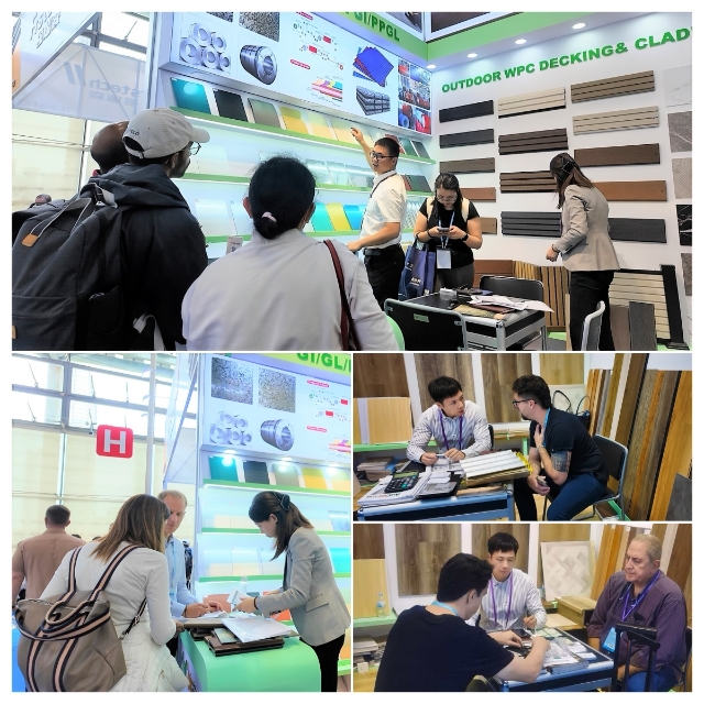 在建材展区,同样亮点纷呈。欧冠平台官网_欧冠online(中国),以“适配性”和“实用性”赢得客户认可。展区重点展示的室内地板、墙板及格栅等产品,可实现“墙地一体化”装修,为客户提供高效、整体的空间解决方案。其中,UV亮面墙板因安装便捷省时的特点,成为现场咨询量最高的产品之一。值得关注的是,“波浪瓦” 作为本次展出的核心亮点产品,凭借其卓越的防水与排水性能、隔热与保温、防火阻燃等特性,吸引了来自南美和非洲区域的多位客户,目前已与阿根廷、津巴布韦和几内亚等国客户达成初步合作意向。